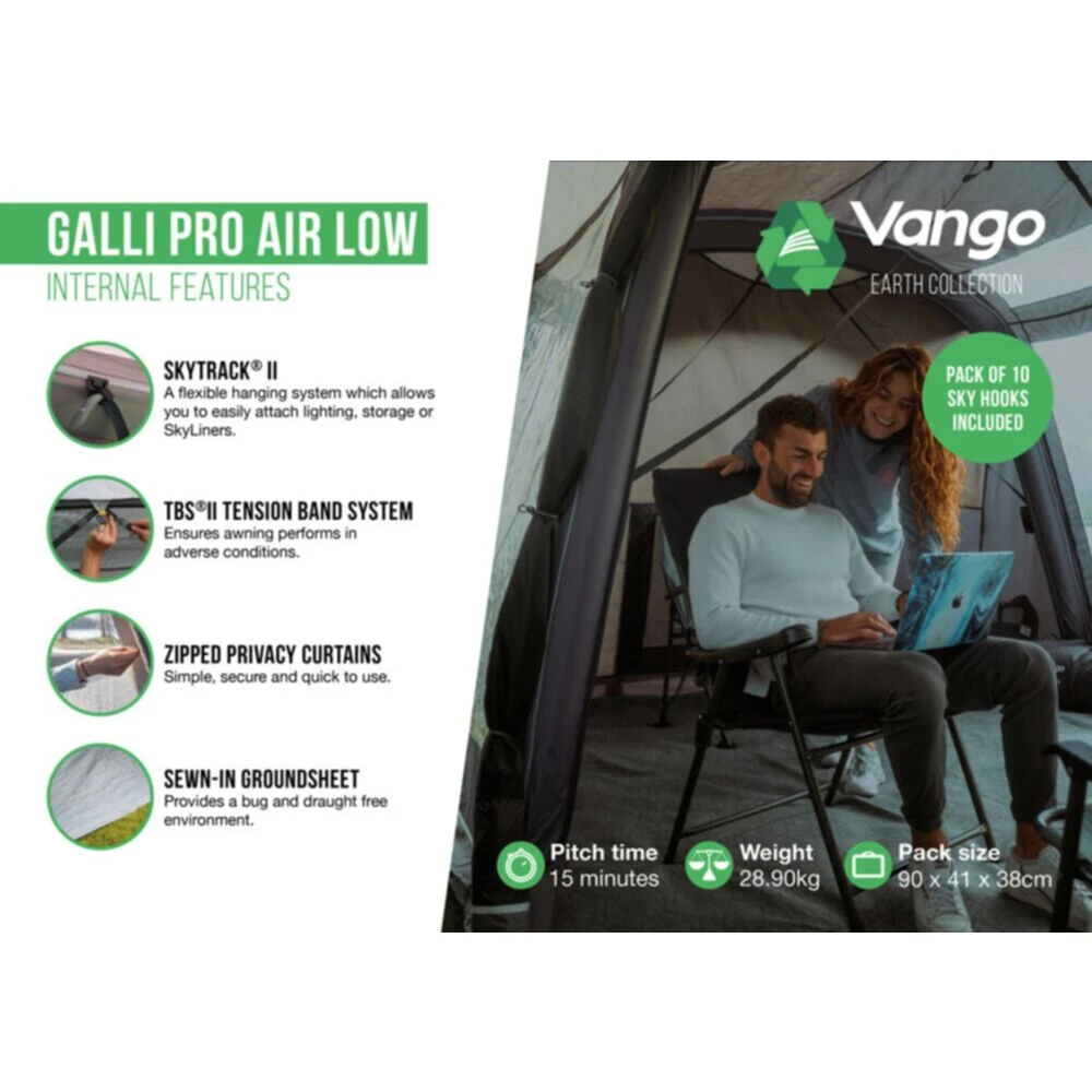 The Vango Galli Pro Air is a new addition to the Vango range with Sentinel Eco Pro fabric, designed to offer a strong, robust shelter with a generous 420 Denier Ripstop Polyester fabric. The Pro features the Closed front Canopy, as, unlike its predecessors, the Galli Eco Pro allows the front to be fully enclosed from the elements. The purpose of the Eco Pro fabric is to offer a more sustainable product for the more eco-conscious, the Galli Low is made from 373 plastic bottles, with a large living space and standing height throughout. It is highly versatile, with a parallel fitting design, to allow the awning to sit alongside the camper van, to maximise the space on the campsite pitch. However, with the connecting panel being to the left, this makes the awning more suitable for vans with their habitation door on the UK passenger side of the van.