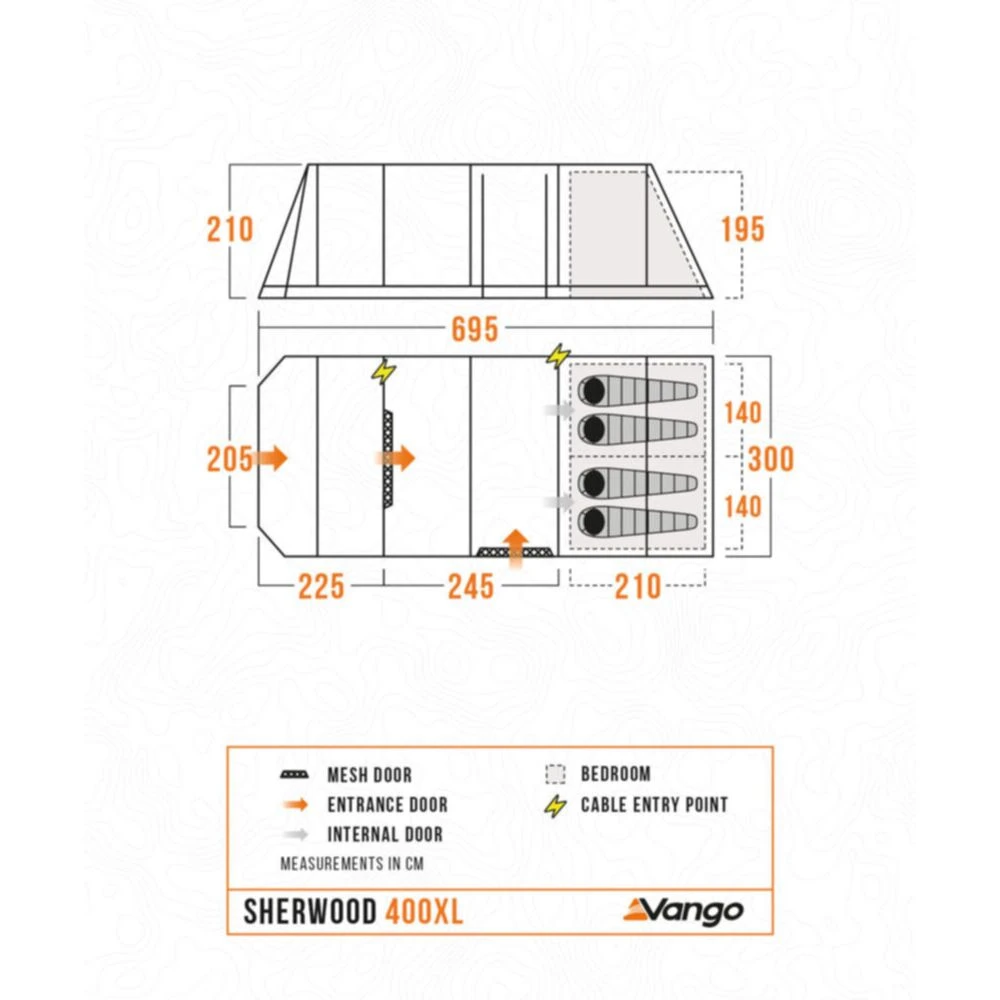 A spacious four-berth tent with three zones, full standing height and a premium outer material fabric. The Sherwood 400xl can sleep up to four people but is ideal for three to keep the product spacious and comfortable. It features a full-enclosable, pre-attached front awning, which adds space and versatility to the tent, a fully-sewn-in groundsheet throughout the living area, and Midnight bedrooms to reduce the impact of early morning sunlight.